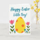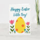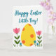 This card features a large yellow egg shape with orange polka dots stretching across the lower half, like a sweet gift waiting in a garden. On either side, two deep pink flowers rise on green stems, leaning slightly inward as if sharing a quiet, friendly moment 🌷. Smaller blue blooms and thin green blades sit near the bottom edge, adding a fresh spring look. Across the upper area, a teal message appears in flowing cursive-style lettering, centered and easy to spot. The lettering sits above the flowers and egg, leaving comfortable white space around it for a calm, open feel. Behind everything, the background stays white with faint light-blue dots scattered lightly, like soft confetti. The simple flat shapes and smooth color fills keep the scene bright and cheerful, with a little bunny-season charm 🐰. The yellow egg, pink flowers, blue blossoms, and teal text stand out clearly against the dotted white background.