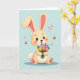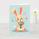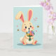 This design shows a light cream long-eared bunny sitting in the center on a pale blue background filled with small repeating flower shapes 🌷. Its pink inner ears, rosy cheeks, and wide smile pair with big dark eyes that seem to gaze at someone just off to the side, like it’s offering a sweet hello 🐰. The bunny holds a full bouquet close to its chest, with soft pastel petals in pink, orange, yellow, blue, and purple, gathered around green stems. A fluffy tail peeks out behind, and the feet face forward with tiny pink pads that add a gentle, friendly touch. Two small striped flying insects hover nearby, adding motion around the still pose. Little heart shapes float upward above the bouquet, suggesting a tender moment shared between friends. The main greeting text sits near the top in a soft pink color, with a smaller line placed below it in a lighter shade. Subtle highlights on the petals and a soft shadow under the bunny give the scene a calm, softly lit look.