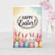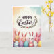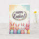 This card features a springtime illustration split into two main sections, with a large “Happy Easter!” greeting centered near the top. The words appear in a flowing, cursive-style lettering in dark gray, nestled inside an olive-green wreath with a small red flower accent. Below, four bunny characters 🐰🐇 peek up from behind a row of oversized decorated eggs, their close spacing and gentle smiles suggesting a friendly togetherness. The background looks like soft watercolor washes in peach, sky blue, and light lavender, giving the scene a calm, airy setting. The bunnies are colored in creamy gold, blush pink, and bright white, with rosy cheeks and wide, shiny eyes that seem to meet the viewer in a tender, welcoming way. In the foreground, the eggs line up across the bottom in deep lavender, turquoise, coral-red, and sunny yellow, each covered with stripes, dots, and small floral motifs. A faint, diffused light softens the edges of the wreath and characters, while the patterned eggs form a colorful band along the lower edge with tiny flower details and curved lines 🌷.
