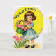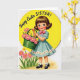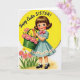 Designed with a vintage-style illustration, this Easter card features a young girl with rosy cheeks, large blue eyes, and neatly combed brown hair framing her face. She wears a pale blue dress with puffed sleeves, a white collar and cuffs, and a coral-pink bow that adds a gentle, friendly touch. Along the hem of her skirt, small white daisy-like flowers with warm yellow-orange centers form a sweet trim above her white socks and black shoes. In her hands she holds an emerald green woven basket overflowing with spring blooms—bright pink flowers with sunny yellow centers, smaller yellow blossoms, and leafy green sprigs 🌷. Behind her, a circular buttercup-yellow backdrop glows like a soft halo, giving the scene a tender, affectionate warmth. A festive Easter greeting appears in flowing cursive-style lettering, arched near the upper left area of the yellow circle in a darker contrasting color 🐰. The background stays simple so the girl and her bouquet feel like the focus of a caring moment. White daisy shapes continue as small decorative accents around the lower edge of her dress.