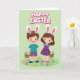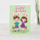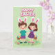 This card shows two young friends, a boy and a girl, standing close and holding hands with bright, happy faces that feel warmly connected. Each wears a simple headband with upright bunny ears lined in pink 🐰, adding a sweet seasonal touch. Behind them is a soft green backdrop that fades gently, while the foreground fills with stylized grass, tiny blossoms, and scattered decorated egg shapes 🌷. Both children hold small woven baskets tipped slightly forward, as if they’ve just found a few more colorful treats together. The light looks soft and even, giving the scene a springtime glow and keeping the colors in gentle pastels. A seasonal greeting sits across the top in thick, dark lettering, centered above their heads for easy reading. Little details like the rosy cheeks, the careful patterns on the eggs, and the small flowers near their shoes add a tender, friendly closeness to the moment. The top text is set above the figures, while the lower area stays open, showing green grass dotted with blossoms and egg shapes.