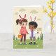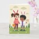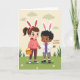 Designed with a sweet spring scene, this card shows two cheerful children standing close together in a green meadow dotted with tiny white flowers 🌷. In the center, a dark-haired girl with a ponytail wears a pink hooded jacket and deep red pants while holding a small orange basket at her side. Next to her, a boy with dark, spiky hair wears a white hoodie and gray shorts, leaning in as their fingers rest gently together like close friends. Both kids wear simple headbands with long animal-like ears, one with red accents and the other with white accents, adding a cute seasonal touch 🐰. Behind them, rolling green hills stretch outward under a creamy sky with soft gray clouds drifting overhead. A short holiday greeting sits near the top in a warm, easy-to-read color, with the letters standing out clearly against the light background. The illustration uses flat shapes and dark outlines, with the pink jacket, orange basket, and ear headbands drawing the eye to the center of the scene.