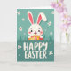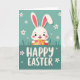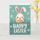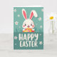Designed with a sweet spring scene, the card features a cute white bunny 🐰 in the upper half, peeking over a green grassy strip as if leaning in to greet someone close. Its long ears are lined with pink, and its rosy cheeks and bright black eyes pair with a wide smile that feels like a friendly, affectionate hello. Tucked in its paws is a decorated egg with polka dots in warm yellow and pink, adding a festive touch and a hint of shared tradition. Behind the bunny, a muted teal background is sprinkled with small white daisy-like flowers 🌷 that keep the setting light and airy. Across the lower portion, a slightly darker teal banner holds a seasonal greeting in large cream-colored letters, centered and easy to read. The layout creates a gentle “peekaboo” moment above the message, like a small surprise meant for a friend or someone you’re fond of. Soft shading and smooth outlines keep everything simple and neat, with cool green-blue tones balancing the warmer accents. The bunny’s paws curl around the dotted egg just above the grassy edge, with little white blossoms scattered across the teal sky.