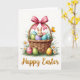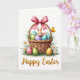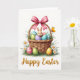 This card features a springtime illustration with a woven basket centered on a bright white background, filled with pastel eggs in lavender, sky blue, soft green, and warm yellow, decorated with dots, stripes, and tiny flower patterns. Nestled among the eggs, a small bunny peeks out 🐰, with wide, gentle eyes and a sweet smile that feels like a friendly greeting. A pink bow with neat stripes is tied to the basket handle, adding a soft romantic touch like a gift meant for someone special. The basket sits in fresh green grass sprinkled with white daisies and sunny yellow centers, with a few extra patterned eggs resting nearby 🐇. Off to the side, a small golden butterfly hovers close, as if drawn toward the basket and the bunny’s welcoming gaze. Soft lighting highlights the basket’s woven texture and the eggs’ smooth sheen without any harsh shadows. Along the bottom, the words “Happy Easter” appear centered in gold lettering, with the basket and bow standing out crisply against the white space.