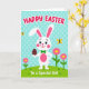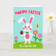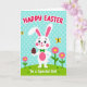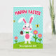 This card features an upright white bunny with pink inner ears, rosy cheeks, and a small green bow tie, holding a dark egg-shaped treat close like a sweet little offering 🐰. The bunny stands on a rolling green hill, angled slightly forward as if stepping closer to share the moment. Behind it, a sky-blue background is sprinkled with lighter dots, giving the scene a light, airy look. Bright pink flowers with yellow centers dot the grass, adding a gentle, friendly charm 🌷. Two small golden-winged insects hover nearby, placed to one side as if they’re drifting along with the bunny’s attention. Across the top, a seasonal greeting appears in red letters, centered and easy to spot against the blue. Near the bottom, a shorter message sits lower on the hill area in a contrasting color, spaced so it doesn’t crowd the character. The overall layout keeps the bunny in the middle, with the dotted sky above and the flowers and insects arranged around it for balance.
