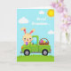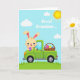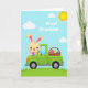 This card features a long-eared bunny 🐰 driving a lime-green vintage-style truck across a grassy field under a light blue sky. The bunny has big blue eyes, rosy cheeks, and an open smile, and its friendly gaze feels like it’s meant for someone special. In one paw it holds a purple egg-shaped treat with a patterned surface, as if bringing a small gift to a close friend. The truck bed carries a woven basket filled with red, yellow, and blue egg shapes decorated with dots and stripes, suggesting a shared springtime outing. Near the top of the sky, a short dedication appears in small, dark lettering, floating above the scene without crowding the artwork. A bright yellow sun glows near the upper corner while a few soft clouds drift nearby, adding a calm, affectionate mood 🌷. The green grass stretches across the bottom with gentle shading, and the rounded truck fenders and simple tires are outlined in darker green.