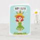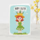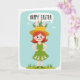 This greeting card features an animated red-haired girl shown full-body with her hands on her hips, smiling wide with rosy circles on her cheeks as if she’s sharing a friendly, affectionate joke. She wears a lime green sundress, and along the hem a row of tiny white long-eared creatures peek out like they’re keeping her company 🐰. A wide-brimmed yellow hat sits on her head, topped with a little garden of rich green leaves and small pink flowers, where more long-eared friends pop up and lean toward her as if drawn to her cheerful energy 🐇. Behind her, a soft pastel blue sky with pale, floating clouds sets a calm springtime scene, while a strip of green grass grounds the image at the bottom. Near the top, a large speech bubble dominates the space, holding a seasonal greeting in thick, hand-drawn letters. The text sits centered inside the bubble and appears in a dark color that stands out clearly against the light background. The hat’s leafy mound is dotted with pink blossoms and several white ears poking through the greenery.