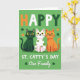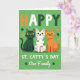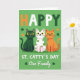 This St. Patrick's Day card features a bright green background that sets a festive scene, with scattered shamrocks and a few orange clovers sprinkled around ☘️. Centered across the middle are three stylized cats lined up shoulder to shoulder, their gentle smiles and wide eyes giving them an easy, friendly closeness 💚. The left cat is a dark green feline with alert yellow eyes and a tiny pink tongue showing, as if it just leaned in to greet the others. In the middle, a white cat wears green polka-dots, adding a light, cozy touch that makes it feel like part of a tight little trio. On the right, an orange tabby with soft stripes rounds out the group, its warm color balancing the cooler greens nearby. At the top, the word “HAPPY” sits above the cats in large letters colored orange, white, and deep emerald green. Beneath the cats, “ST. CATTY’S DAY” appears in a simple sans-serif style, with “Our Family” placed right after it in a flowing cursive look. The green field behind them is dotted with small shamrocks and occasional orange clovers, framing the trio like confetti on a holiday backdrop.