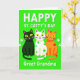 This greeting card shows three cartoon cats—one black, one white, and one orange—standing close together as if they’re posing for a friendly group photo, their wide smiles and bright yellow eyes giving them an affectionate, in-on-the-joke look 💚. Behind them is a rich green background that leans toward neon, setting a St. Patrick’s Day scene without needing any extra props. The white cat wears green polka dots and the orange cat has red spots, adding a cozy, buddy-like contrast while the black cat keeps things simple and sleek. Small white shamrocks are scattered around the edges like confetti, framing the trio with a festive touch ☘️. At the top, the phrase “HAPPY ST. CATTY’S DAY” sits in crisp white letters, centered and easy to read against the green. At the bottom, “Great Grandma” appears in smaller white text, tucked neatly under the cats like a name label. Each cat has a sweet pink nose and a slightly rosy mouth, and the trio is arranged front and center against the glowing green field with white shamrocks dotted around them.