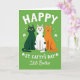 This card shows three stylized cats posed front-facing in a neat row on an emerald green background dotted with small white shamrocks ☘️. In the middle sits a white cat with dark green spots, leaning slightly toward its companions as if enjoying being close. A deep forest green cat stands on the left and a ginger-orange cat on the right, and their gentle smiles and wide yellow eyes give the scene a friendly, affectionate feel 💚. Near the top, the word “HAPPY” appears in large white letters, centered above the cats. Just below that, “ST. CATTY’S DAY” is written in matching white type, also centered and easy to read. Lower down, the phrase “Little Brother” appears in smaller white text, tucked beneath the main greeting. The cats have smooth outlines with light shading, and the shamrock shapes repeat across the green field behind them.