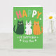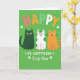 This card shows three cartoon-style cats lined up across the middle on a lime green background, their big eyes and small smiles turned toward each other like close friends sharing an inside joke 💚. One cat is deep emerald green, the next is white with green spots, and the third is warm orange, giving the trio a cozy, friendly contrast. Above their heads, “HAPPY” sits near the top in rounded letters, each letter a different color so it stands out against the green. Below the cats, the pun “ST. CATTY’S DAY” is placed in a prominent line, with “Step Mom,” tucked beneath it like a quiet dedication. Small shamrocks decorate the layout around the text, adding little touches of holiday detail ☘️. The cats’ gentle expressions and slight lean toward one another suggest an affectionate bond without needing any extra fuss. The lettering has a slight shaded look that gives it a bit of depth while the rest stays flat and graphic. Shamrock shapes frame the words, with green tones repeating throughout the background and accents.