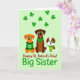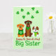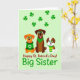 Designed with a pale lime green background, this St. Patrick’s Day card features three friendly, human-like dogs posed close together as if they’re a tight little crew. A larger dark brown dog sits in the center wearing a green bandana, leaning slightly toward its pals with a tender, easy grin. To the left, an orange dog in a green sweater marked with a shamrock seems to angle its gaze toward the middle, like it’s sharing a private joke. On the right, a smaller white-and-brown spotted pup wears a green-and-lime striped top, and all three have green-rimmed glasses and tiny pink tongues peeking out for a sweet, affectionate look 💚. Across the upper area, small green shamrocks drift like confetti, adding a lucky holiday touch ☘️. Under the dogs, “Happy St. Patrick’s Day!” appears in red, with “Big Sister” set beneath it in a strong green, centered and easy to spot. The trio is arranged in a balanced row with the shamrocks scattered above and the two-line message anchored neatly below.