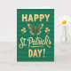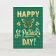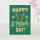 Designed with a rich forest-green background, the card sets a cozy St. Patrick’s Day scene with a subtle diamond pattern that feels like textured fabric. Centered near the top, the word “HAPPY” appears in uppercase gold letters with a sandy shimmer, drawing the eye right away. Just below it, “St. Patrick’s DAY!” is written in flowing gold lettering that curves gently, like a note passed between close friends 💚. In the middle sits an emerald-green butterfly, its wings edged with fine gold detailing and dotted with creamy, pearl-like spots, giving it a soft, treasured look. On either side of the butterfly, two matching three-leaf shamrocks in warm gold frame the center as if they’re leaning in toward each other ☘️. The lighting is diffused, making the gold accents gleam and giving the butterfly and shamrocks a slightly raised, dimensional appearance. Share St. Patrick’s Day sentiments with someone special.