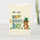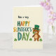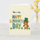 Designed with a creamy neutral background, this St. Patrick’s Day card centers on the greeting “Have a very HAPPY St. Patrick’s DAY” in large, multi-colored letters that feel lively and welcoming 💚. The words stretch across the middle, with “HAPPY” standing out in bigger type, while “St. Patrick’s DAY” sits just below in layered greens ranging from deep teal to bright lime. Sunny yellow and warm orange accents mix in with the greens, giving the lettering a festive, rhythmic look without feeling busy. On the right side, a cute cartoon bear in a green leprechaun hat with a golden buckle leans in close, holding a three-leaf clover gently in its mouth, like it’s offering it to someone special ☘️. The bear’s soft expression and slight tilt suggest a friendly, affectionate moment, as if sharing a quiet inside joke during the holiday. Small shamrock shapes are scattered around the design, adding little pops of green that guide your eye around the card. The overall layout stays airy and bright, with even lighting and clear spacing between the lines of text and the bear illustration. Tiny shamrocks dot the open areas near the edges, framing the message and the bear on the right.