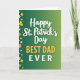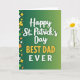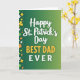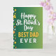 This card features a smooth green gradient background that shifts from deep emerald on the left to a brighter golden-lime on the right, setting a festive St. Patrick’s Day scene 💚. Along the left edge, a flowing border of shamrocks and tiny blossoms trails upward like a lucky garland, dotted with small white specks. The shapes are colored in light green, yellow, orange, and white, with a few soft green leaves tucked between them for contrast. Centered in the open space, the words “Happy St. Patrick’s Day” appear in white cursive lettering, slightly angled and easy to spot against the green. Just below, “BEST DAD” sits in large golden-yellow all-caps, giving the message a proud, affectionate emphasis ☘️. The word “EVER” follows beneath in white all-caps, smaller than “BEST DAD,” so the layout reads clearly from top to bottom. Light shadowing under the letters and some of the shamrocks adds a gentle lifted look. The left-side shamrock border is densest near the top and thins as it drifts downward beside the centered text.