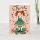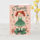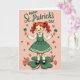 This design shows a smiling young girl with reddish-brown pigtails standing on a large green shamrock, her rosy cheeks and bright eyes turned outward as if sharing the moment with a close friend. She wears an emerald-green pinafore with thin white trim over a white collared shirt, and her arms stretch wide in an inviting pose. In each hand she holds a small three-leaf clover, like two tiny gifts offered with an easy, affectionate grin 💚. The background is a soft pastel pink that gently sets off the greens, giving the scene a sweet, cozy contrast. Small shamrocks and coral-colored little flowers are sprinkled around her, adding extra St. Patrick’s Day detail without crowding the space ☘️. Across the top, the message “HAPPY St. Patrick’s DAY” is placed like a header in a dark green, flowing hand-lettered style. The big shamrock beneath her feet is centered and rounded, with lighter green highlights along its edges.