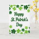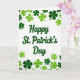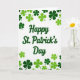 This greeting card features “Happy St. Patrick’s Day” centered in dark green lettering on a bright white background, with the words taking up most of the middle space. Around the message, shamrocks scatter like a loose frame, some in deep emerald and others in lighter lime green for contrast. The mix of greens feels like two friends leaning in side by side—different shades, but clearly meant to match 💚. The layout stays open and airy, so the clovers feel like they’re floating in from the edges rather than crowding the page. The text sits cleanly in the center while the shamrocks cluster more heavily near the corners, guiding your eye back to the greeting. A few clovers overlap slightly and tilt at different angles, adding a gentle sense of movement without making the design busy ☘️. The white space between leaves and letters keeps everything easy to read, while the darker clovers anchor the border and the lighter ones add a soft lift. Several shamrocks appear near the top and bottom edges, with alternating shades creating a simple, balanced ring around the central message.
