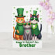 Designed with three dressed-up cats on a bright white background, this St. Patrick’s Day scene feels like a friendly little group photo 💚. On the left stands a ginger tabby with emerald-green eyes, wearing a ribbed green turtleneck and a leprechaun top hat with a gold buckle, angled as if leaning in toward the others. In the middle, a smaller grey cat wears yellow-framed green sunglasses, and a small green heart on its chest gives it a tender, “I’m with you” kind of presence. On the right, a black-and-white tuxedo cat is dressed in a green suit jacket with gold buttons and a green bow tie, its rectangular green sunglasses and matching leprechaun hat making it look cool but still part of the trio. A few three-leaf shamrocks float around them like confetti, adding a light holiday touch ☘️. Along the bottom, the message “Happy St. Patrick’s Day Brother” is set in green text, centered and easy to spot against the white space. Soft, even lighting brings out the fuzzy fur texture and the slight shine on the hats, while the shamrocks vary in size across the background.