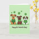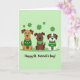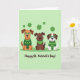 This greeting card shows three friendly dogs sitting side by side on a soft pastel green background, meeting your eyes with an easy, affectionate closeness that feels like close friends posing together 💚. Above them, small shamrocks drift across the upper area, adding a light St. Patrick’s Day touch without crowding the scene ☘️. On the left, a warm tan dog wears green-rimmed glasses and a green sweater decorated with three shamrocks, leaning slightly toward the others as if included in an inside joke. In the middle, a darker brown dog keeps it simple with a green bandana, its relaxed posture tying the group together. On the right, a white-and-brown spotted dog also wears green glasses and a green striped sweater, sitting neatly as if happy to match the theme. The message “Happy St. Patrick’s Day!” is placed prominently near the bottom in bright green lettering that stands out clearly against the pale background. The overall layout is balanced, with the trio centered and the text anchoring the lower portion, making it easy to share St. Patrick’s Day sentiments. Shamrocks float near the top while the three dogs remain centered in a tidy row beneath the bright green greeting.