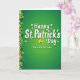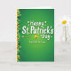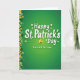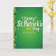 This card features an emerald-green background that shifts from a deeper green near the edges to a lighter lime glow toward the center, setting a festive St. Patrick’s Day scene 💚. Along the left side, a flowing border of shamrocks trails downward, mixing golden-orange clovers with softer green ones in different sizes for depth. In the middle, “Happy St. Patrick’s Day” appears in large white lettering, centered and easy to read, with tiny clover-and-star accents sprinkled around it ☘️. A single golden shamrock near the main line is highlighted with a small arrow, drawing the eye like a gentle point of attention. Just below, “FATHER IN LAW” sits in smaller white uppercase letters, placed neatly under the greeting as a direct nod to a close family bond. Subtle shadowing behind the words makes the text look slightly raised from the green field. The overall layout feels warm and friendly, like a cheerful toast shared between people who genuinely enjoy each other’s company. The left-edge shamrock border remains the main decorative frame, with gold and green shapes stepping down the side against the smooth green gradient.
