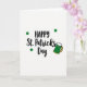 This card features a white background with “HAPPY St. Patrick’s Day” centered in black lettering, with “St. Patrick’s Day” set just beneath “HAPPY” for a layered look. Deep green shamrocks are scattered around the words, drifting like confetti and giving the layout a lively, friendly rhythm ☘️. On the right side, a stylized green beer mug leans slightly, as if raised toward someone across the table in a quiet toast 💚. The mug has a thick, foamy white top, and a yellow-gold handle and rim that add a warm accent against the greens. The spacing leaves plenty of open white area, so the message stays easy to read while the icons frame it. The shamrocks vary a bit in size and placement, which makes the scene feel like two friends decorating together, trading smiles as they go. The palette stays mostly black, white, green, and a touch of yellow, with the mug and shamrocks balancing the text in the center. Several shamrocks float near the top-left and bottom-left corners while the tilted mug holds the right edge.