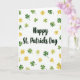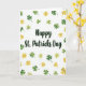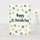This card features the greeting “Happy St. Patricks Day” centered in deep green lettering on a bright white background, setting a friendly, close-to-the-heart tone 💚. The words feel like they lean toward you, as if a friend is smiling across the table and sliding the card your way. Around the text, shamrocks drift across the front in soft watercolor shapes, like little notes passed back and forth. The greens range from dark emerald to light lime, and the mix gives the page a gentle, springlike lift. Here and there, a few shamrocks shift into warm golden yellow, adding a cozy, affectionate glow that brings to mind shared laughs and a quiet toast ☘️. The wide white space keeps everything airy, so the message stays easy to read while the scattered clovers keep it lively. The salutation sits in the middle, with the shamrocks sprinkled above, below, and along the sides in varying sizes and soft-edged brushstrokes.
