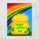 A colorful and bright Saint Patrick's Day design that says "Happy St. Patrick's Day" on a pot of gold at the end of a rainbow.