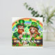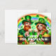 Happy St Patrick's Day Holiday Card with a Man and Women Leprechaun Drinking Green Beer a Pot of Gold, Clovers and a Rainbow