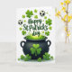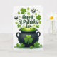 This card shows a dark, rounded cauldron centered on a bright white background, with a soft shaded texture that makes it look gently lit. From the top, a thick tuft of green grass and small shamrocks spills upward and outward, glowing in a golden-green halo that feels like a lucky secret shared between friends 💚. The clovers vary in size and shade, and their scattered placement gives the scene a light, floating motion without crowding the space. Near the top, the text “Happy St Patrick’s day” sits above the cauldron in rich emerald green, arcing across the page and standing out clearly. Two black-and-white soccer balls sit near the upper corners, adding a fun, modern twist that suggests a friendly match and shared laughs ☘️. Additional shamrocks dot the area around the words and drift toward the center, guiding your eye back to the glowing greens. Broad, heart-shaped clover leaves decorate the cauldron itself, while smaller clusters sprinkle the foreground in neat little groups. The upper corners are punctuated by the two soccer balls, with shamrocks sprinkled nearby against the white space.