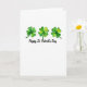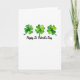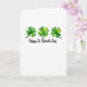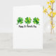 This greeting card features three watercolor shamrocks lined up across the top of a bright white background, their heart-shaped leaves shaded from deep emerald to sunny lime 💚. Each shamrock has a slender curved stem, and the soft paint edges give them a gentle, close-together look, like friends leaning in for a photo. Beneath them, the words “Happy St. Patrick’s Day” sit centered in a flowing green handwritten style, with plenty of open space around the lettering. The roomy white field keeps everything airy and lets the greens stand out without feeling busy. Subtle light-and-shadow shifts inside each leaf add depth, like sunlight passing over a small bunch of clover ☘️. The overall layout feels calm and affectionate, with the trio of shamrocks arranged evenly as if they’re quietly keeping each other company. The top row of shamrocks is horizontal and balanced, and the green text below forms a neat visual anchor on the lower half of the card.
