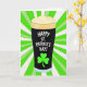 This card features a centrally placed pint of stout with a deep, dark body and a tall, creamy cap of foam, like it’s being raised for a friendly toast 💚. Across the front of the glass, the text “HAPPY ST. PATRICK’S DAY!” sits in bright white, drawn in an easy, casual style that reads clearly at a glance. Just below the words, a neon-green shamrock rests on the glass, its three leaves standing out like a little lucky charm ☘️. Behind the pint, lime-green and white rays spread outward in a sunburst pattern, giving the scene a lively, party-ready backdrop. The strong contrast between black, green, and white keeps the focus on the drink while still making the background feel energetic. The overall look suggests a warm invite to clink glasses with someone you like, with the foam and shamrock acting like small, affectionate touches in the center. The message text stays centered on the glass, with the shamrock directly underneath it, framed by radiating green-and-white stripes that fill the entire background.