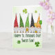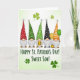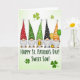This card features five gnomes lined up in a friendly row, their long white beards and rosy noses giving them a cozy, close-knit look. Each gnome wears a different green-toned hat with patterns and a little pom‑pom, with touches of red, black, and orange adding contrast. The background is a soft pale-green gradient that feels like early spring, and scattered shamrocks float above them ☘️. One gnome holds up a golden mug as if toasting a friend, while another stands near a small black pot that hints at treasure. Near the end of the row, one gnome holds a green balloon, and a gold balloon sits close by, like a pair meant to stay together 💚. Centered beneath the gnomes, the message “Happy St. Patrick’s Day! Sweet Son!” appears in green lettering. The shamrocks drift across the top area while the gnomes anchor the bottom half in a neat horizontal line.