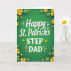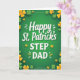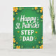 This card features a deep emerald green background with a gentle gradient that draws your eye toward the center 💚. The message “Happy St. Patrick’s STEP DAD” sits front and center, with “Happy St. Patrick’s” in flowing white lettering above “STEP DAD” in strong white capital letters. Around the words, scattered shamrocks and four-leaf clovers in several sizes create a cozy, close-to-the-heart feel, like a warm nod between friends or family members who truly get each other ☘️. The clovers mix classic greens with touches of golden yellow and soft shading that gives them a slightly raised look. Small starburst accents sparkle near “Happy” and “DAD,” adding little flashes of celebration without crowding the message. A thin, lighter-green line frames the central area, keeping the layout tidy while letting the clovers drift around the edges. Share St. Patrick’s Day sentiments with someone special.