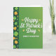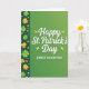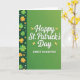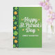 This card features a festive St. Patrick’s Day layout split into two sections, with a wide gradient green area on the right and a slimmer dark emerald panel on the left. Centered on the right side, “Happy St. Patrick’s Day” appears in white flowing lettering with a soft raised look, giving it a gentle, affectionate touch 💚. Small ochre arrow shapes sit around the main phrase, subtly pointing inward as if drawing two people closer in a friendly, warm exchange. Below the main greeting, “SWEET DAUGHTER” is set in white all-caps sans-serif, placed neatly under the larger words for a clear, supportive emphasis. The left panel acts like a decorative border, filled with repeating shamrocks in several spring-green tones and sprinkled with golden-orange four-leaf clovers ☘️. Tiny white blossoms and scattered white dots are tucked between the leaves, adding extra texture without crowding the pattern. The dark emerald strip on the left contrasts with the lighter green field on the right, and the shamrocks repeat in a tight pattern from top to bottom.