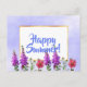 A postcard decorated with a blue sky as backdrop, and summer flowers like purple foxgloves. A chic faux gold frame. Blue hand lettered style script and the text: Happy Summer!