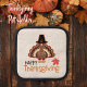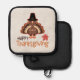 Celebrate Thanksgiving with this adorable pilgrim turkey pot holder on faux linen that's wishing everyone a "Happy Thanksgiving".