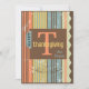Striped Thanksgiving Card. A pretty combination of fall colors including light pumpkin, gray blue, yellow, and brown. There is a cute blue file folder tab on the edge of the paper that has a large T and says Thanksgiving. Some pretty dark brown scrollwork finishes off the card. The card is appropriate for friends or family. Could work as an invitation to Thanksgiving dinner or a fall celebration. Warm tones and creative stripes make this unique card very attractive.