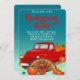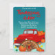This invitation design highlights the Thanksgiving celebration with a truck full of pumpkins, a turkey, and fall leaves.
