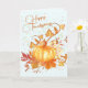 Thanksgiving greeting card with message inside. Autumn pumpkin and leaves design on the front with “Happy Thanksgiving” text. Card is pale blue with orange, yellow and red colors. Write your own personal message with signature inside using modern, handwritten font style.