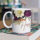 Trendy modern coffee Thanksgiving mug featuring flowers with dried leaves and foliage, grapes, and a chic faux gold typography Happy Thanksgiving script