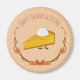 Magnet with a Thanksgiving design. A smiling piece of pumpkin pie that's topped with whipped cream is surrounded by a seasonal frame of autumn leaves and decorative branches. Above the design the words "Happy Thanksgiving" show. Those words can be customized as you like.