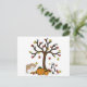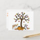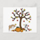 This postcard has two Siberian Huskies pouncing and playing in the leaves falling from a tree with pumpkins.