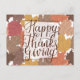Original seasonal design featuring artistic handwritten "Happy Thanksgiving" lettering in square frame over autumn leaves backdrop.