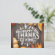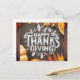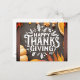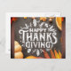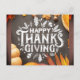 A Thanksgiving-themed image features a dark gray background adorned with white chalk-style lettering that reads "HAPPY THANKSGIVING." The text is stylized with flourishes and decorative elements such as leaves and acorns. Surrounding the central text are various autumnal elements. To the left, there's a pale-yellow pumpkin, and at the top right, a slice of pumpkin pie. Scattered around are acorns and leaves in shades of orange, yellow, and brown, contributing to the fall aesthetic. The image is framed by a border that transitions from dark brown to a lighter shade, providing depth and contrast. The overall composition is festive and evokes the spirit of the Thanksgiving holiday.