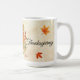 Personalize this Unique "One of a Kind" Happy Thanksgiving Pumpkin Mug! It Features a Beautiful Orange Pumpkin Surrounded by Fall Leaves in Shades of Light Orange, Dark Orange and Green with Orange Berries and Brown Mushrooms on a Tan Background!