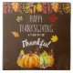 A ceramic tile which says: Happy Thanksgiving a time to be thankful. A watercolor illustration of pumpkins, acorns, mushrooms and seasonal autumn leaves. A border along the top also composed of fall leaves, berries, acorns, and other foliage. Oak, maple and elm leaves falling down around the lettering. Dark brown background.