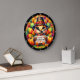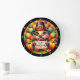 This festive Thanksgiving clock features a cute turkey wearing a pilgrim hat, holding a "HAPPY THANKSGIVING" sign. Surrounding the turkey are colorful fall leaves and pumpkins. The clock has a black border with white numbers 1-12.