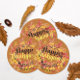 Personalized Thanksgiving sticker design featuring a watercolor fall leaves wreath on an ochre background. The text is fully customizable. To change it use the Personalize option. For more changes, such as changes to the font, font color, text layout or the color of the background, use the Edit design tool option.