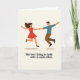 This heartfelt greeting card shows a stylized couple jumping into the air while holding hands, set against a soft beige background. The woman wears a flowing red dress, her dark hair swept back as she smiles and lifts one arm in excitement. Beside her, the man wears a teal shirt with warm brown pants, kicking one leg out as he jumps with the same joyful expression. Small oval shadows beneath their feet suggest a moment frozen mid-leap, full of energy and happiness. Centered near the bottom, the message reads, “The best thing to hold onto is each other,” in simple black lettering that’s easy to read. The scene captures love, support, and togetherness, making this card a thoughtful choice for sharing affection with someone special on Valentine’s Day.