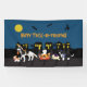 A group of cats and dogs go trick or treating on Halloween Night! The pets in this design include a Akita Inu puppy dressed as a cowboy, a Norwegian Forest Cat with a princess crown, a Siberian Husky pulling a wagon with a pumpkin in it, a Persian cat dressed as an angel, a papillon, a basset hound, a basenji, a Pomeranian dressed as a witch, and a border collie dressed as a police dog. Meanwhile, bats and witches are flying above the neighborhood under a full moon! This design can be customized or personalized by adding your own text or images!